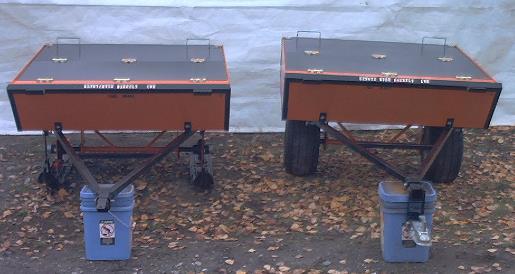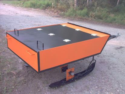 Hauling Sled/Trailer: This sled can come with wheels, or skis as shown below. It will attach to snow machine or 4-wheeler. This model is built with welded steel and can be used to dump ash from a large 3000, 1000, 500 gallon Incinerator.