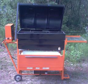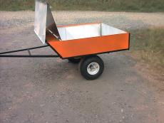 Notice folding top cover to secure ash from flying out of trailer during transport. For easier removal, the rear door can be removed. Notice Hitch to attach to motorized off-road vehicle.
